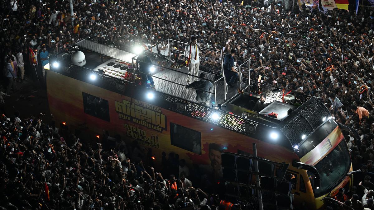 Initially, the crowd was sparse, leading one to believe that the turnout would be low. However, the numbers swelled around 4 p.m., after Vijay’s rally in Namakkal. The crowd waited patiently as high-energy songs praising him were being played