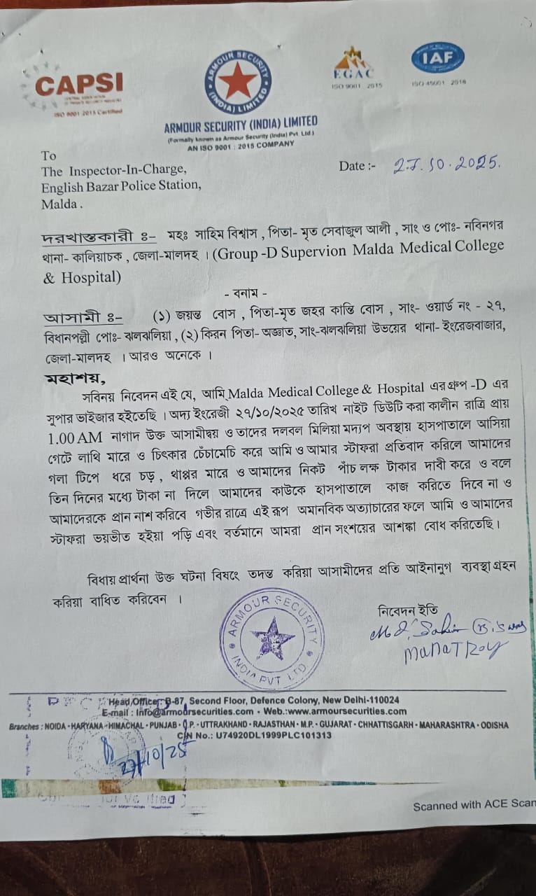 বেঙ্গল ওয়াচ নিউজ ডেস্ক: মালদা:- অস্থায়ী গ্রুপ ডি কর্মীদের মারধর পাঁচ লক্ষ্য টাকা দাবি টাকা না দিলে প্রাণনাশের হুমকি। তৃণমূল শ্রমিক নেতার নামে লিখিত অভিযোগ দায়ের থানায়। মালদা মেডিকেল কলেজ হাসপাতালের ঘটনা।