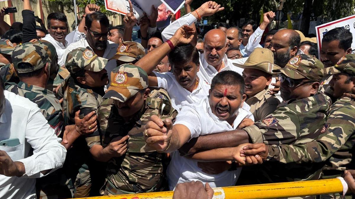 BJP holds protesting demanding unveiling on Rajyotsava Day